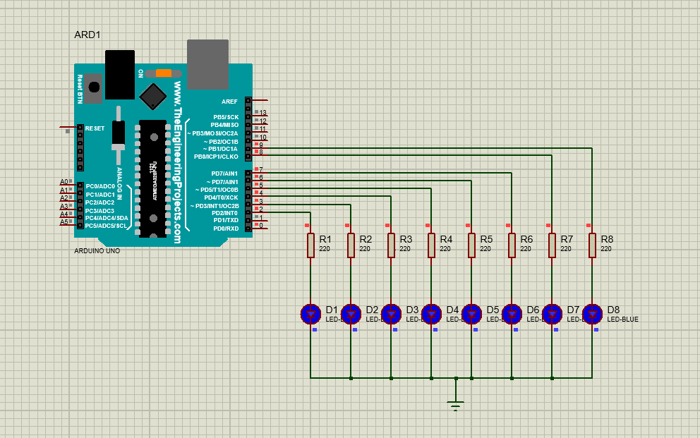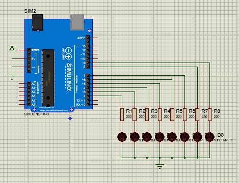 pin 2 sampai 9 pada pin-pin digital arduino uno dihubungkan masing-masing ke 8 buah LED yang sebelumnya diberi hambatan masing-masing 220 ohm, kemudian setiap LED dihubung ke ground. arus listrik dari pin 2-9 yang merupakan pin output akan mengalir ke resistor kemudian mengalir ke LED melalui kaki positif (anoda) dan kemudian ke kaki negatif (katoda) yang kemudian ke ground.