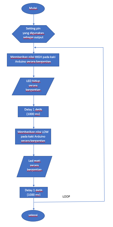 delay(1000);  //Jarak waktu 1000ms(1 detik) untuk melakukan perulangan atau looping atau LED hidup selama 1000ms(1 detik)